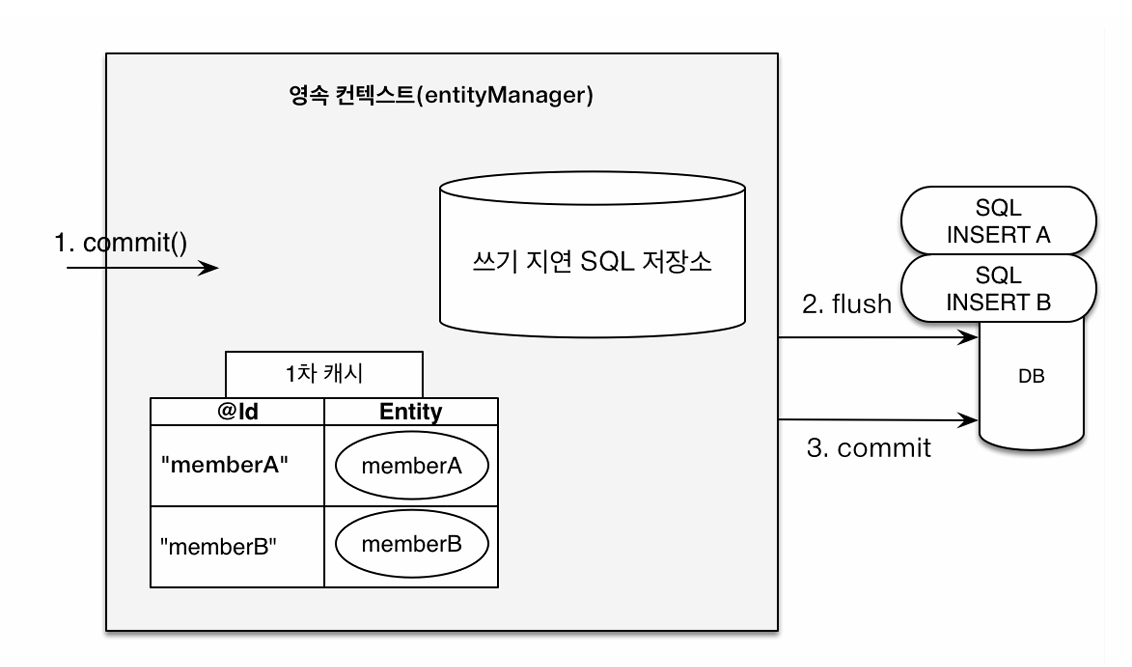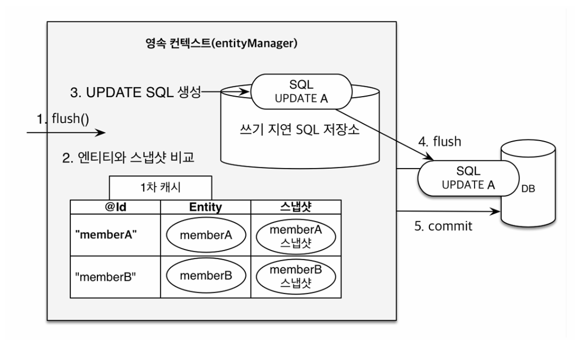 ์ท์ ๊ฐ์ ์ต์ด๋ก ์ฝ์ด์จ ์์ ์ ์ํ๋ฅผ ์ ์ฅํ๊ณ , flush๋๋ ์์ ์ Entity์ ์ค๋