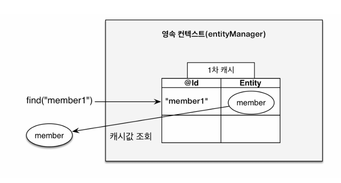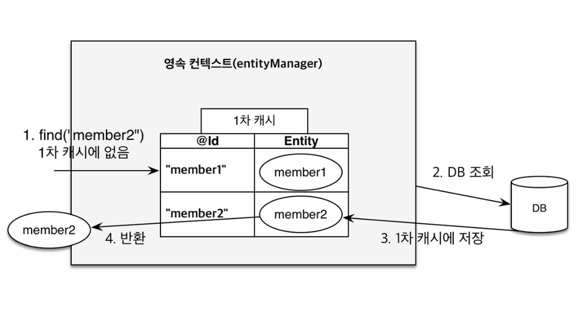 Member findMember2 = em.find(Member.class, "member2"); // DB์กฐํ ํ 1์ฐจ์บ์์ ์ ์ฅ